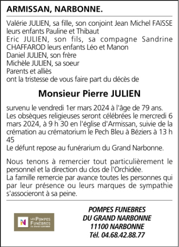 Décédé à Narbonne (11100, France) le vendredi 1 mars 2024 à l'âge de 79 ans