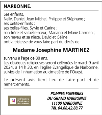 Décédée à Narbonne (11100, France) le jeudi 4 avril 2024 à l'âge de 86 ans