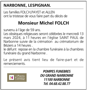 Décédé à Béziers (34500, France) le vendredi 8 mars 2024 à l'âge de 59 ans