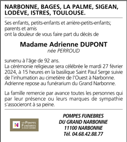 Décédée à Narbonne (11100, France) le jeudi 22 février 2024 à l'âge de 92 ans