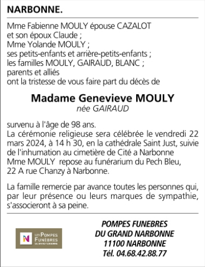 Madame GENEVIEVE MOULY née GAIRAUD