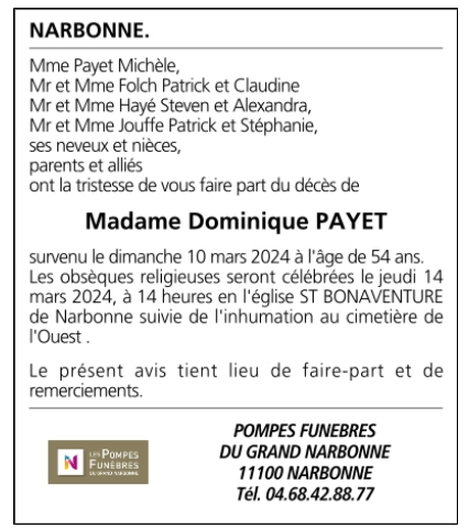 Décédée à Lézignan-Corbières (11200, France) le dimanche 10 mars 2024 à l'âge de 54 ans